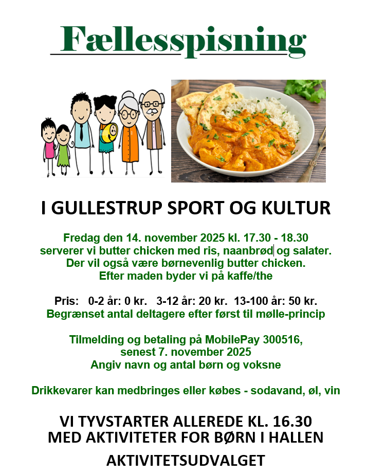 Fællesspisning – nemt og lækkert – og hyggeligt. Fredag d. 14. nov. 2025